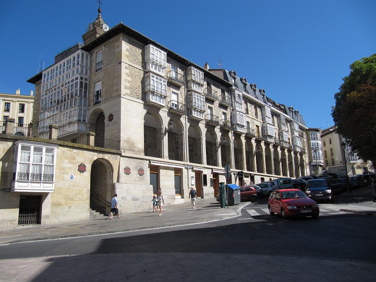 En el frente de la plaza se sitúa el Ayuntamiento de Vitoria - Gasteiz. Al fondo, en la foto, vemos las torres de San Miguel, izquierda y San Vicente, derecha.